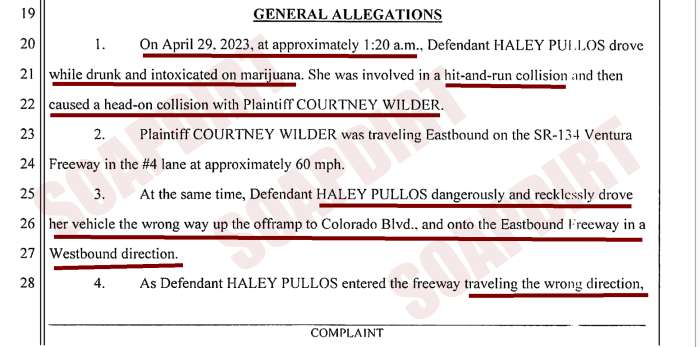 “On April 29th, 2023, at approximately 1:20 AM, defendant Haley Pullos drove while drunk and intoxicated on marijuana. She was involved in a hit-and-run collision and then caused a head-on collision with plaintiff Courtney Wilder.”